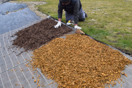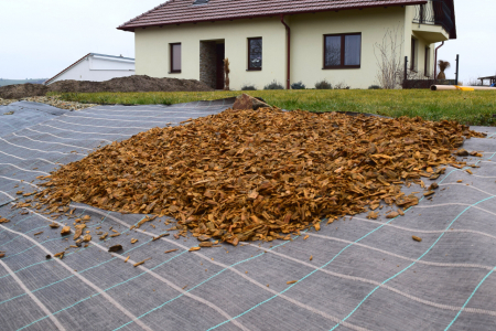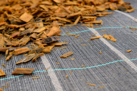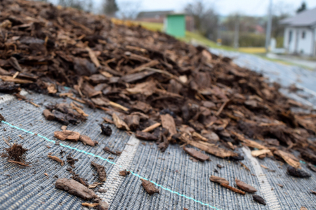 - Na textilii umístěte rovnoměrnou vrstvu mulčovací kůry.